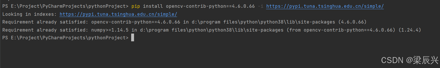 命令:pip install opencv-contrib-python==4.6.0.66 -i https://pypi.tuna.tsinghua.edu.cn/simple/,发现它并没有安装到该项目的环境下,而是安装到Python配置的全局环境中。