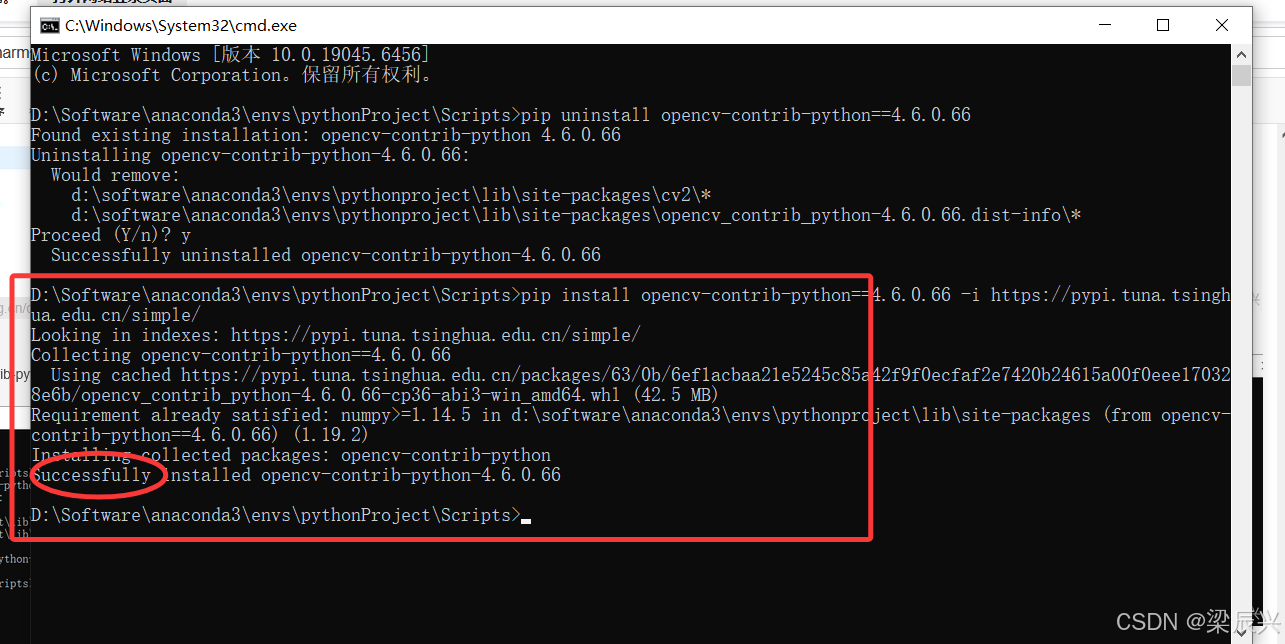 4,重新执行:pip install opencv-contrib-python==4.6.0.66 -i https://pypi.tuna.tsinghua.edu.cn/simple/,出现successful,安装成功。