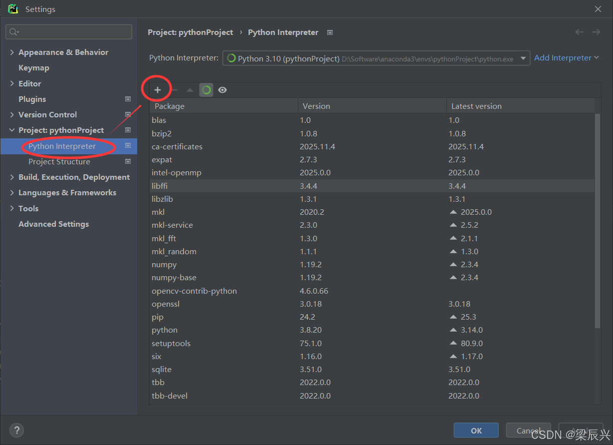 2,选择【Python interpreter】------单击【+】添加库(包)。
