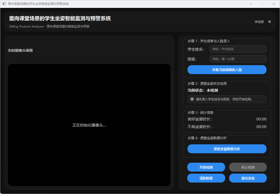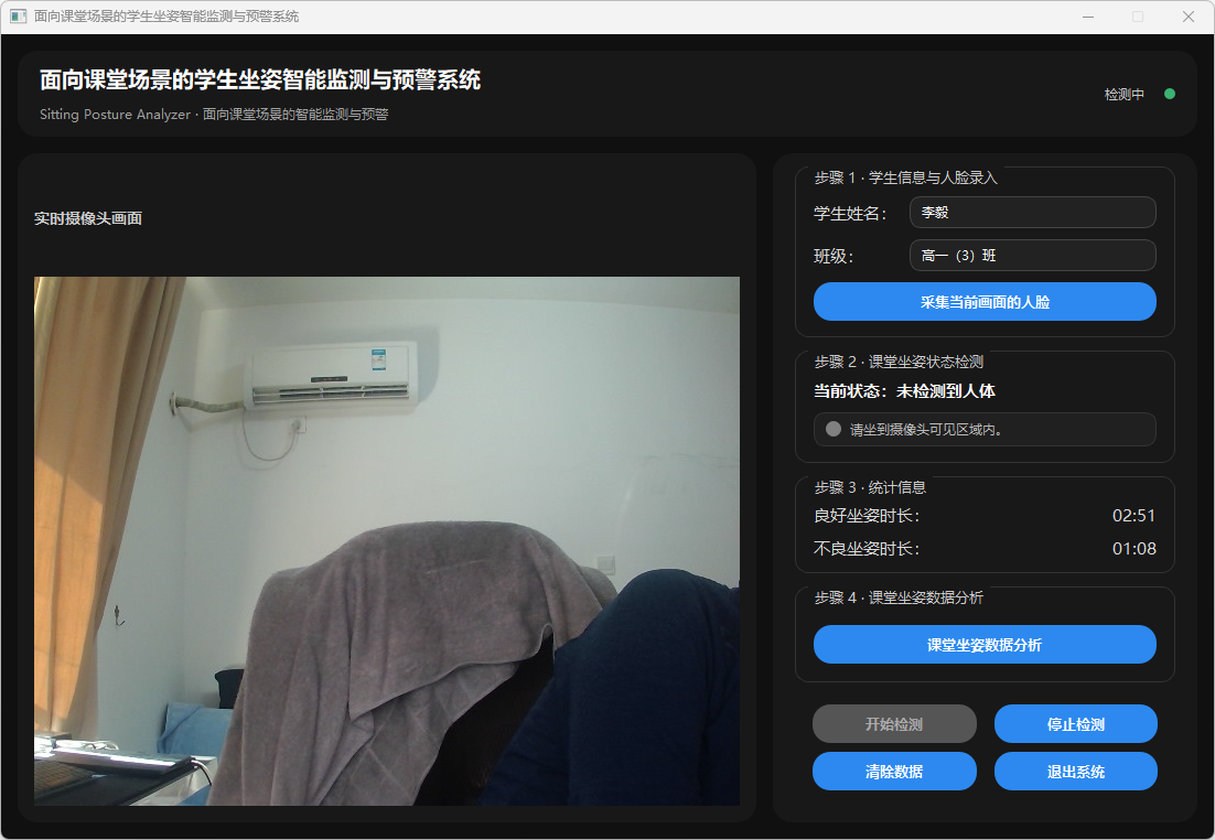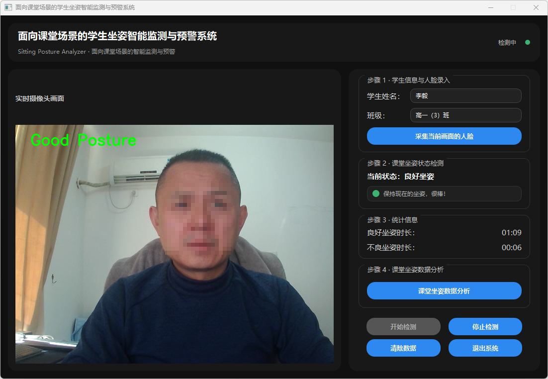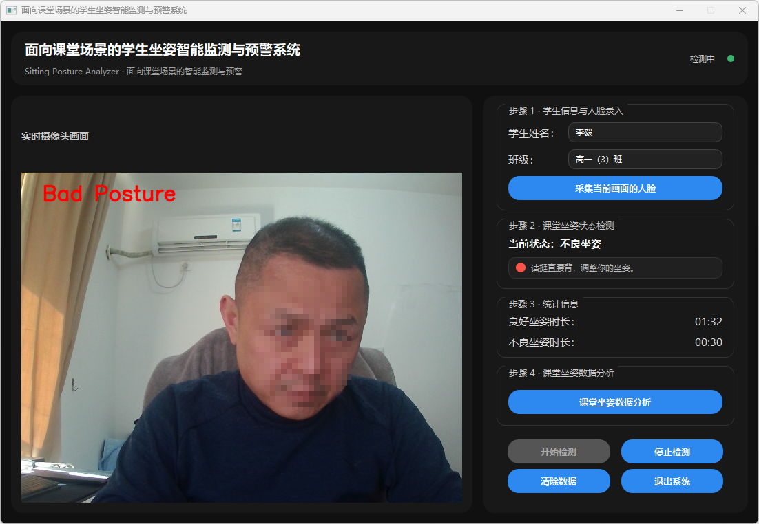 实验结果表明,所提出的系统能够高效、准确地进行实时坐姿检测和反馈,并在健康管理中具有较高的实用性,为学生的坐姿健康管理提供了有效的技术手段。