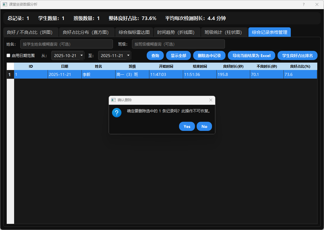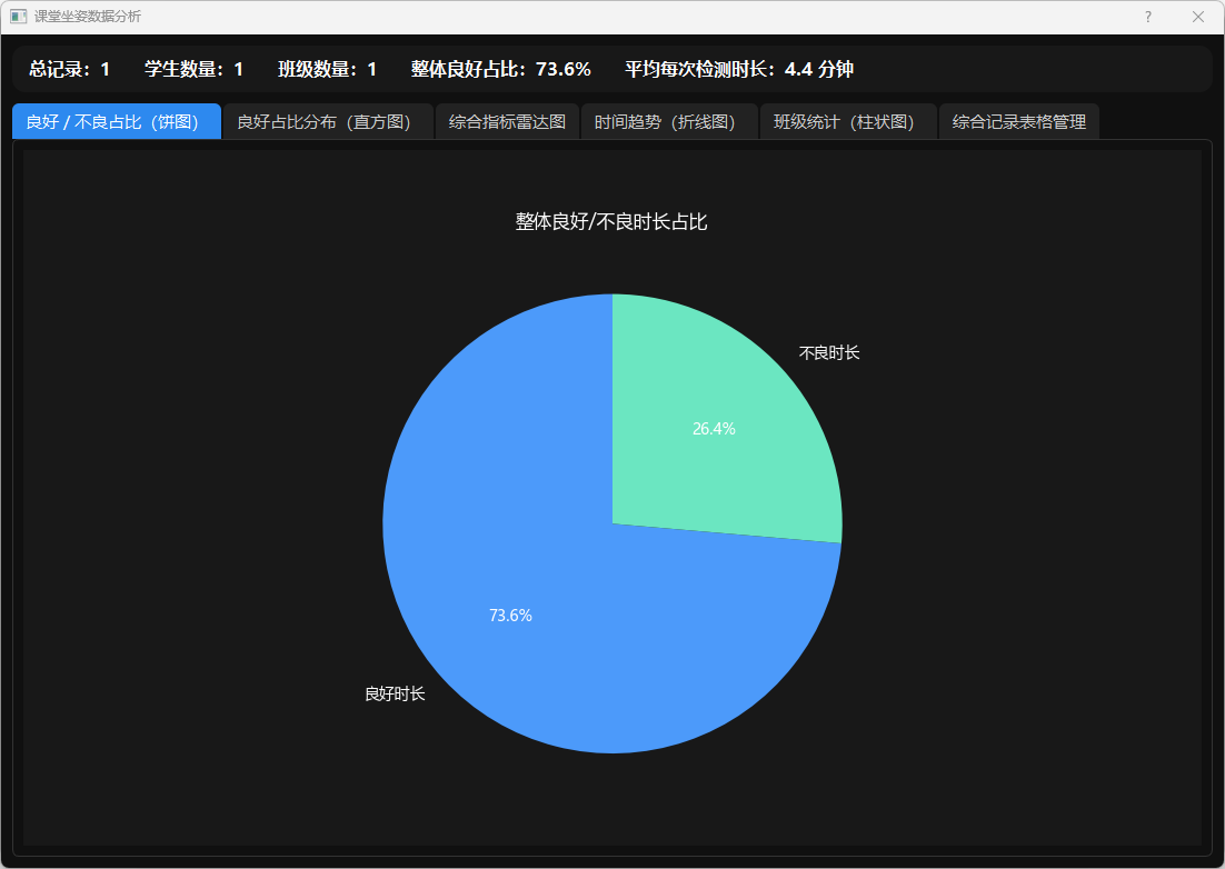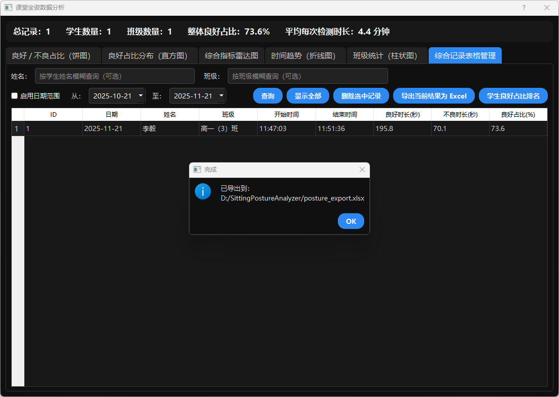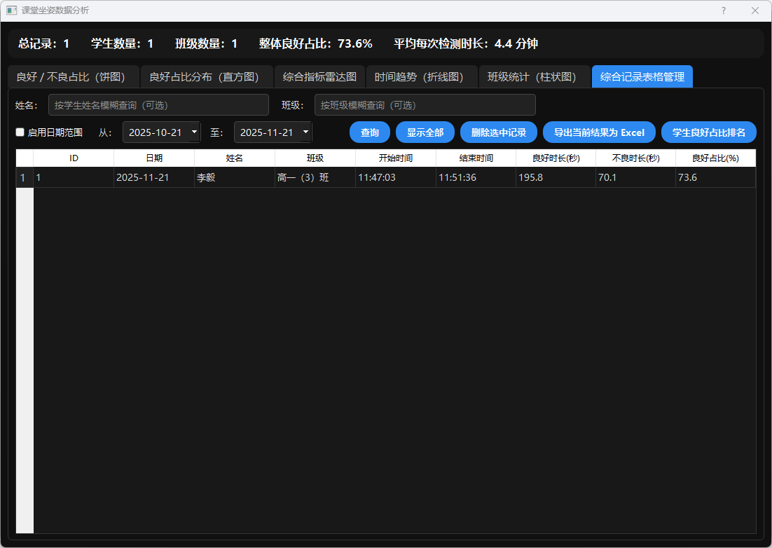 系统采用随机森林分类器对提取的特征进行处理,从而对坐姿进行分类,判断其为"良好坐姿"或"不良坐姿"。当系统检测到不良坐姿持续超过设定的时间阈值时,会自动触发语音提醒功能,提示学生及时调整坐姿。此外,系统还支持对历史数据进行分析与可视化,生成关于学生和班级的坐姿统计信息,为教育管理者提供健康管理决策支持。