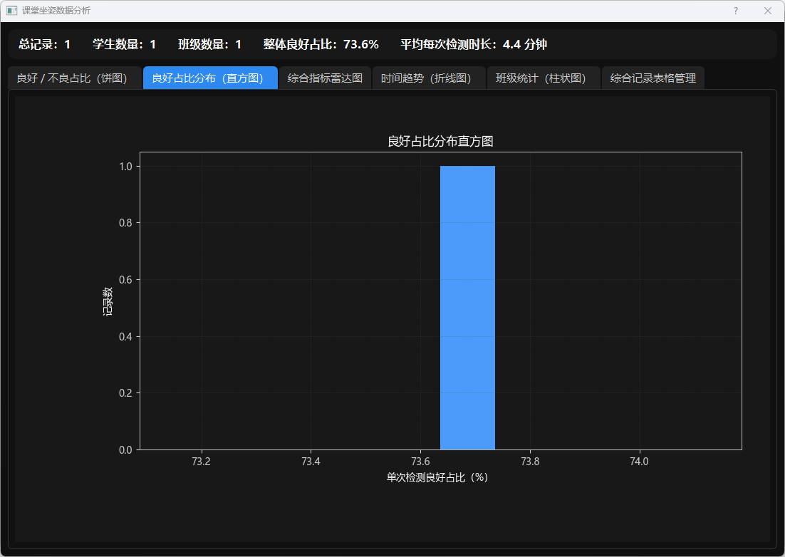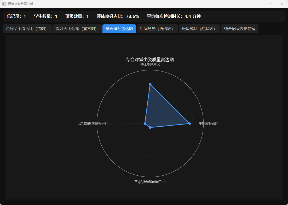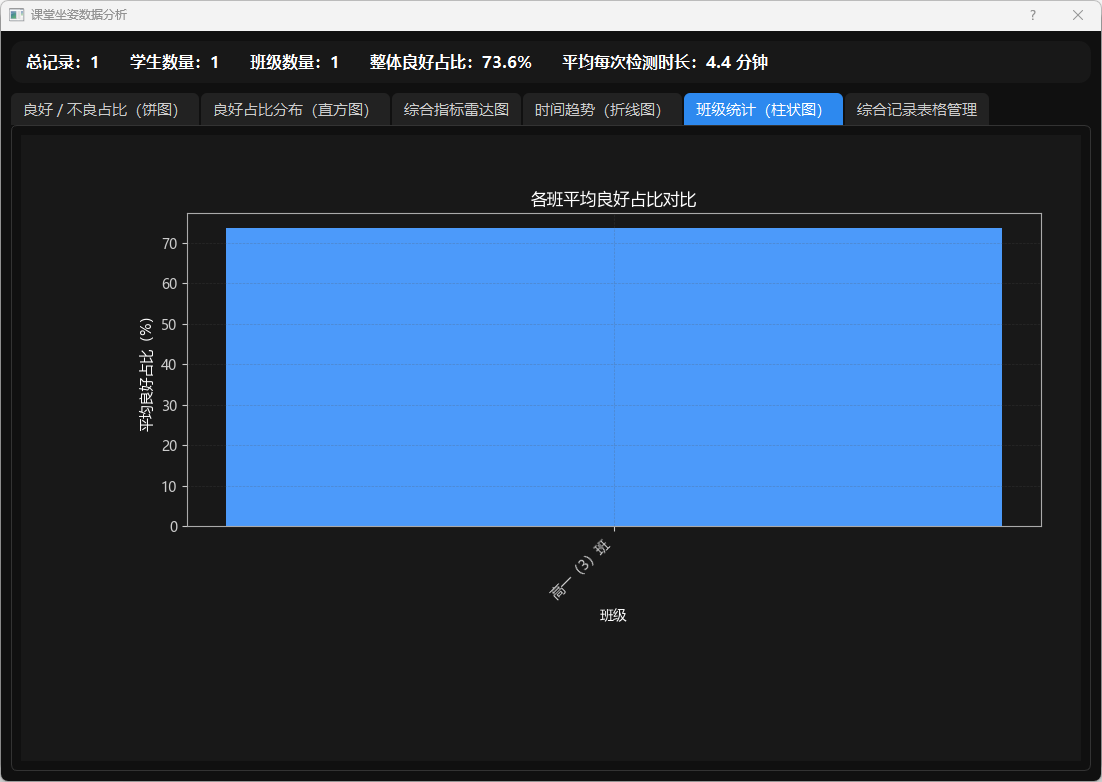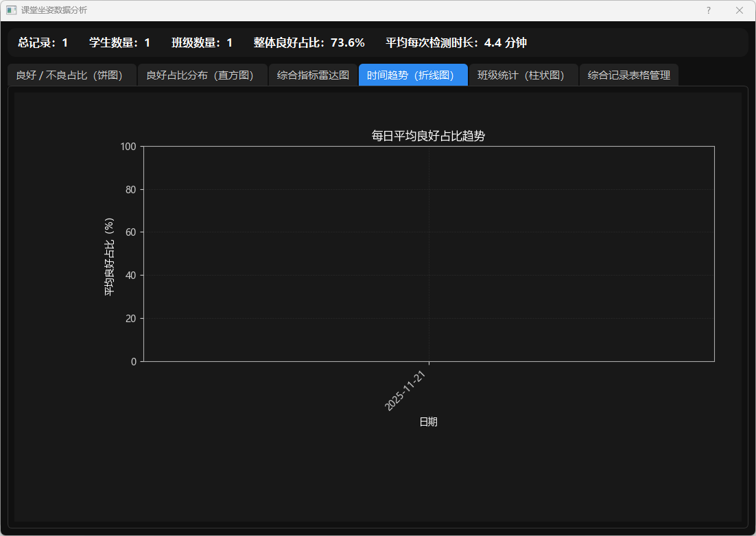 系统采用随机森林分类器对提取的特征进行处理,从而对坐姿进行分类,判断其为"良好坐姿"或"不良坐姿"。当系统检测到不良坐姿持续超过设定的时间阈值时,会自动触发语音提醒功能,提示学生及时调整坐姿。此外,系统还支持对历史数据进行分析与可视化,生成关于学生和班级的坐姿统计信息,为教育管理者提供健康管理决策支持。