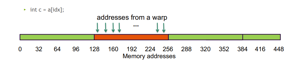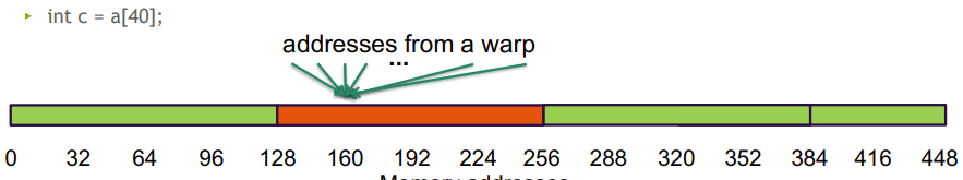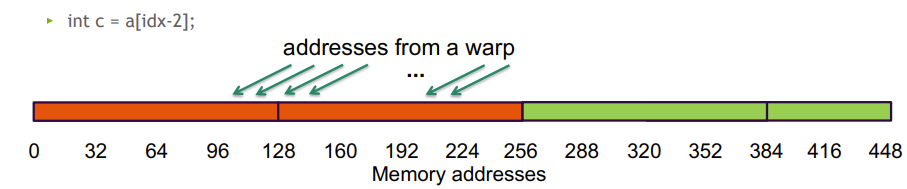 - 连续访问 128 字节, 但跨两个128 B段, 硬件需要两次内存事务来处理这 32 个int, 带宽利用率 50%