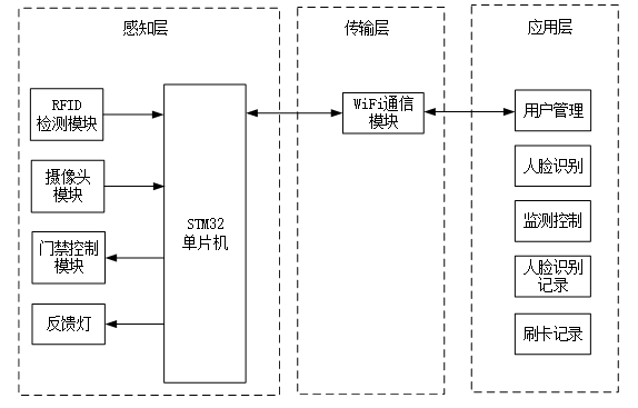 基于物联网的智能楼宇门禁系统架构采用STM32单片机作为核心控制单元,通过WiFi模块与Web管理中心连接,实现数据的实时传输和远程管理。系统配备RFID模块用于身份卡识别,结合USB串流摄像头实现人脸识别,确保用户身份的精确验证。系统通过舵机控制门禁的开关,红外传感器监测人员的进入情况,实现自动开关门。管理员可以通过Web管理平台为用户绑定身份卡和人脸信息,设定不同的访问权限。用户在绑定后,可以通过刷卡或人脸识别进入楼宇,提高门禁的安全性和便捷性。红外传感器则用于自动检测人员通过门禁后,控制门禁自动关闭,减少人工干预,提高门禁系统的自动化水平。系统还具备历史记录功能,所有进入门禁的事件均会被系统记录并存储,管理员可以在Web平台查看详细的历史记录,确保系统的透明度和可追溯性。如图2-1所示为系统总体设计架构。