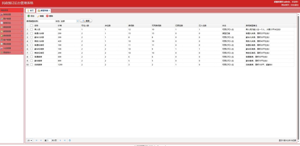 (7)房型管理功能,包括房间类型信息的编辑、查询与管理;