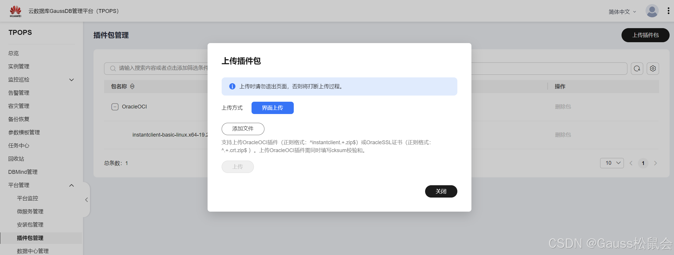 执行上传插件包,会把instantclient压缩包上传到 tpops服务器的 /opt/sftphome/sftpservice/package/plugin/OracleOCI/ 目录下,该目录是sftp服务器的目录。