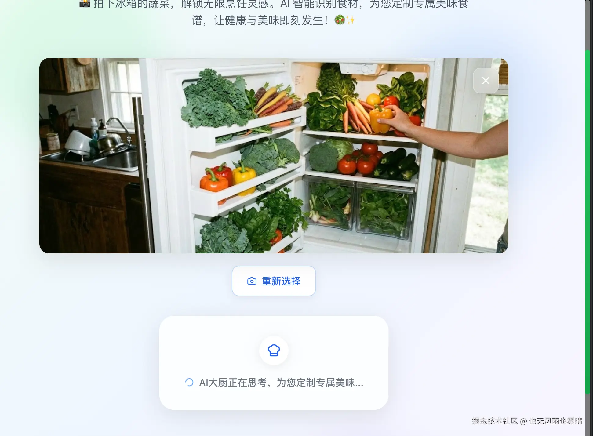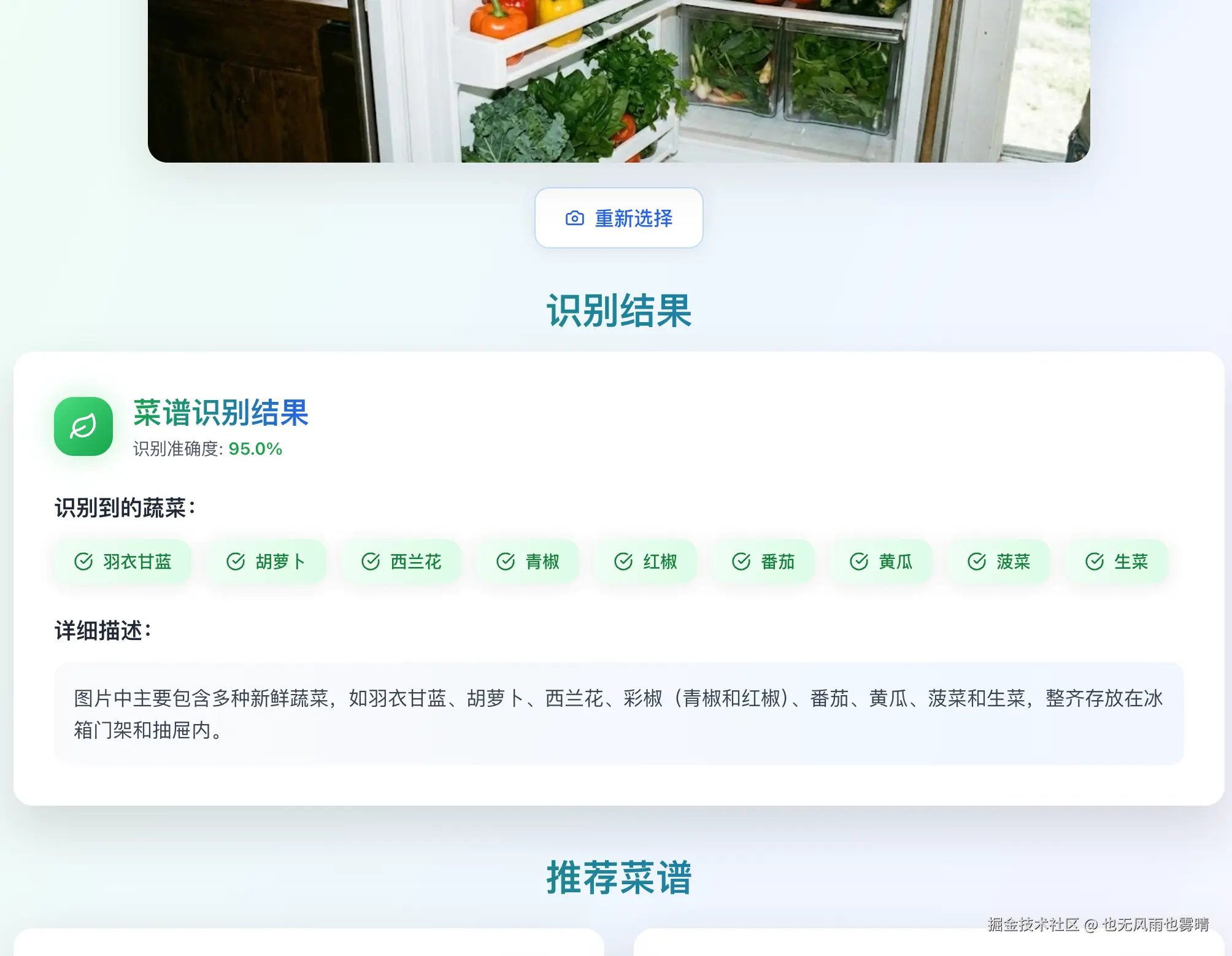 很多时候我们在家面对冰箱里剩下的食材,可能不知道该吃什么、做什么。针对这个痛点,我们设计了这款产品:用户只需使用手机进行拍照,系统就会通过视觉模型对菜品进行识别,然后给出相关的菜谱推荐。
