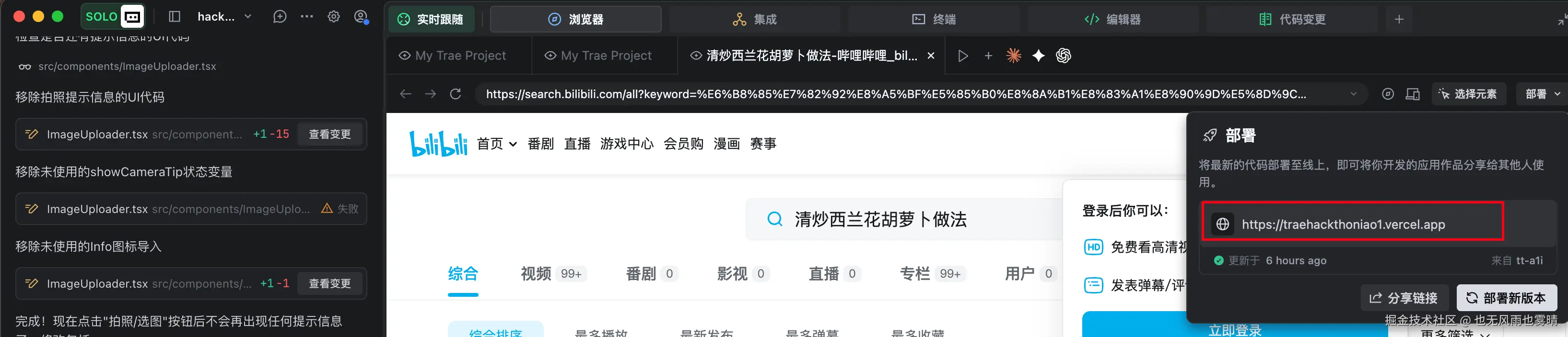 Trae Solo 甚至内置了 一键部署 的功能,直接就可以把我们的产品部署到 Vercel 服务上,生成一个可在公网访问的 Web 链接: