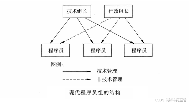 现代程序员组:实际的 "主程序员" 应该由两个人共同担任:一个技术负责人,负责小组的技术活动;一个行政负责人,负责所有非技术性事务的管理决策。技术组长自然要参与全部代码审查工作,因为他要对代码的各方面质量负责;相反,行政组长不可以参与代码审查工作,因为他的职责是对程序员的业绩进行评价。行政组长应该在常规调度会议上了解每名组员的技术能力和工作业绩。