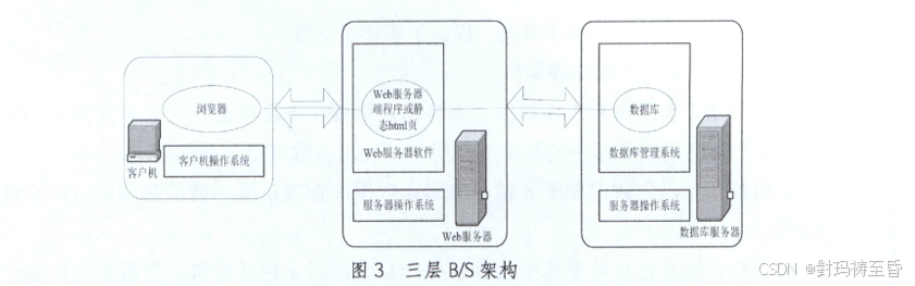 由客户机、Web 服务器、数据库服务器三层构成 。 在这种结构中,用户开发的系统分成两部分,一部分是数据库 ,部署在数据库服务器上,另一部分是 Web 服务器端程序(其形式可能是 ASP 页、JSP 页、PHP 页、ASPX 页等)或静态 HTML 页,部署在 Web 服务器上,置于 Web 服务器软件的管理之下。
