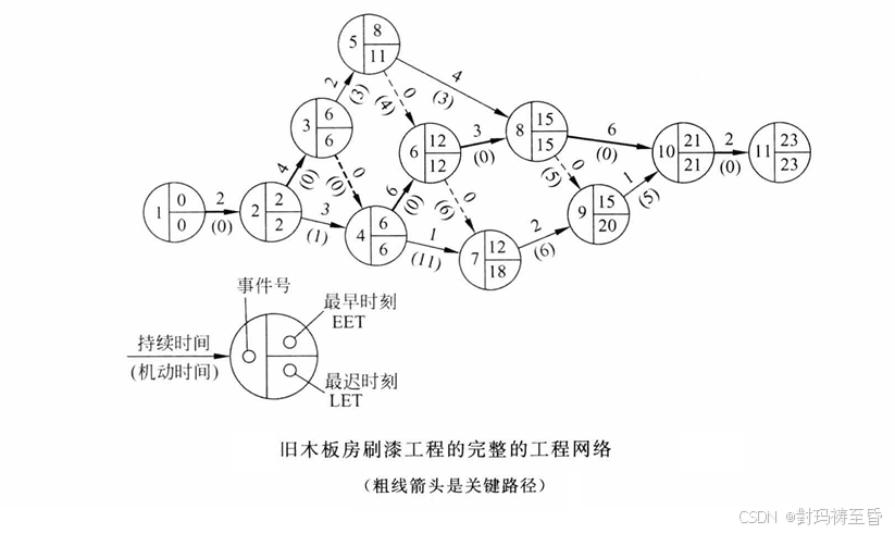 在工程网络中用箭头表示作业 (例如,刮旧漆,刷新漆,清理等),用圆圈表示事件 (一项作业开始或结束)。++注意,事件仅仅是可以明确定义的时间点,它并不消耗时间和资源。++作业通常既消耗资源又需要持续一定时间。