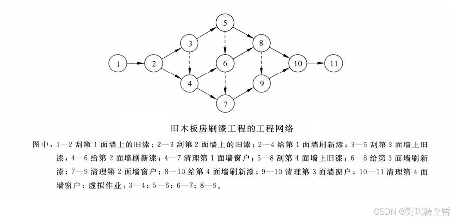虚线箭头表示虚拟作业,也就是事实上并不存在的作业。引入虚拟作业是为了显式地表示作业之间的依赖关系。例如,事件4既是给第1面墙刷新漆结束,又是给第2面墙刷新漆开始(作业4---6)。但是,在开始给第2面墙刷新漆之前,不仅必须已经给第1面墙刷完了新漆,而且第2面墙上的旧漆也必须已经刮净(事件3)。也就是说,在事件3和事件4之间有依赖关系,或者说在作业2---3(刮第2面墙上旧漆)和作业4---6(给第2面墙刷新漆)之间有依赖关系,虚拟作业3---4明确地表示了这种依赖关系。(先2---3,后4---6)