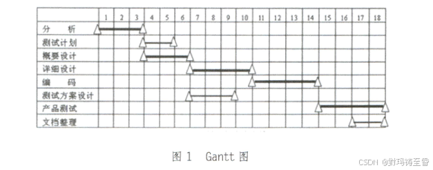 常见的进度安排的图形化方法有甘特(Gantt)图和计划评审技术(PERT)图。**Gantt图:**用水平线段表示任务的工作阶段;线段的起点和终点分别对应着任务的开工时间和完成时间;线段的长度表示完成任务所需的时间。