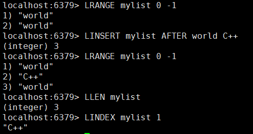 - LINSERT:在特定位置插入元素。