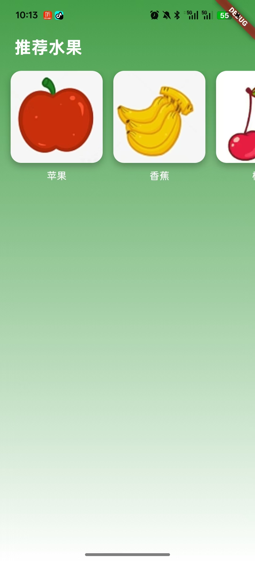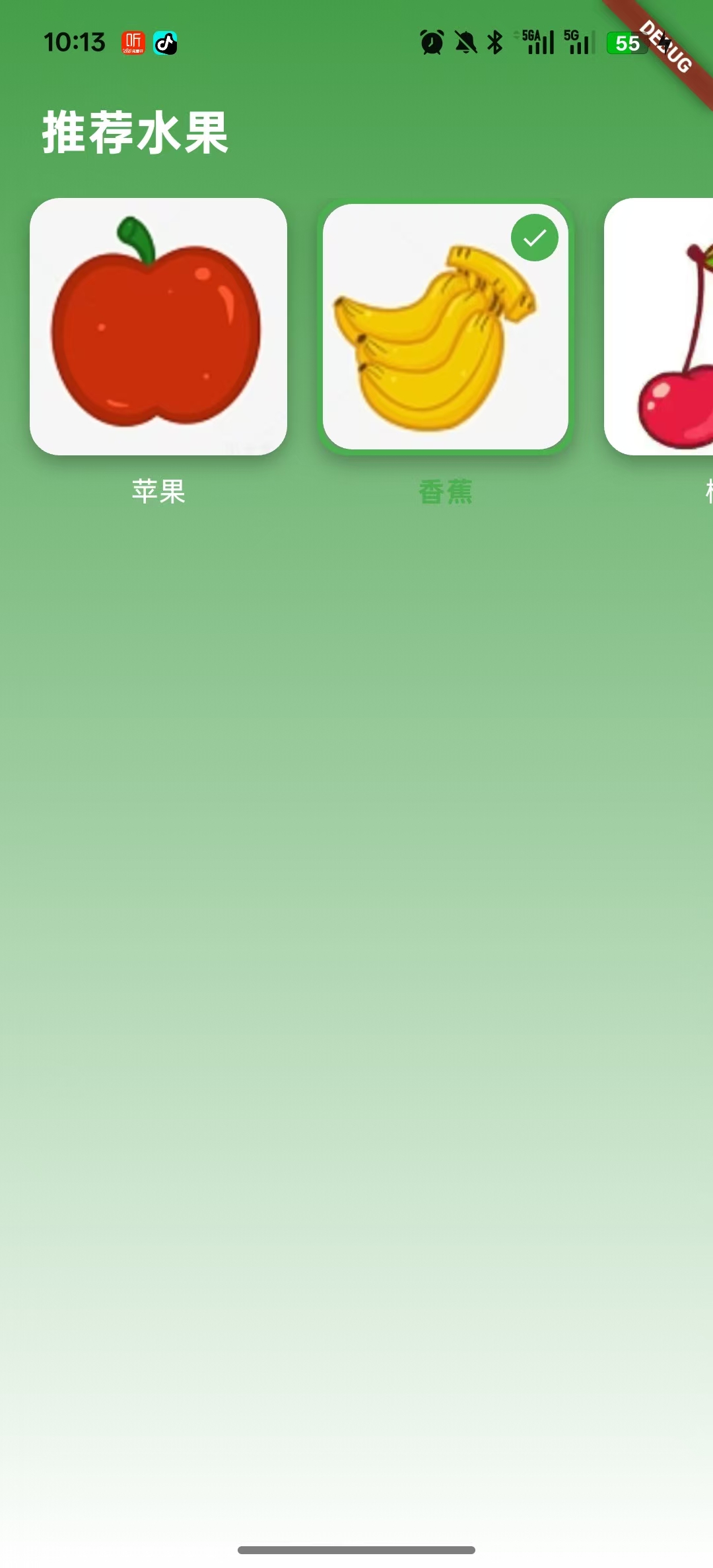 详细介绍:这是一个使用ListView.builder来建造的横向滚动水果数据列表,当点击的时候会有一个选中图标和选中边框,并且文字的颜色也会发生更改。