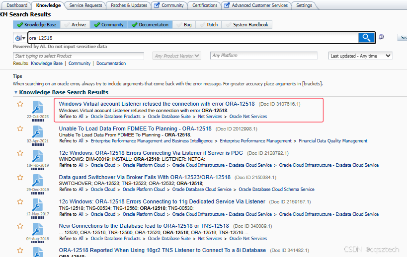 一通操作下来,问题没有解决,开始怀疑人生了,老师傅遇到新问题,平时很少遇到这种问题,因为在WINDOWS上安装的ORACLE不多,难道是WINDOWS上特有的问题,赶紧查查MOS,还好,第一个就是 虚拟账号监听拒绝连接,报ORA-12518
