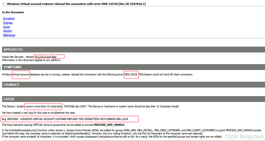 这个问题,就是主机名超过15个字符,同时,安装数据库软件时,选择的是使用虚拟账号安装数据库软件,正好碰到 Bug 38542990 - WINDOWS VIRTUAL ACCOUNT LISTENER REFUSED THE CONNECTION WITH ERROR ORA-12518 ,而平时没有遇到,是因为我一般选择的内置账户安装的,所以没有遇到这个问题。