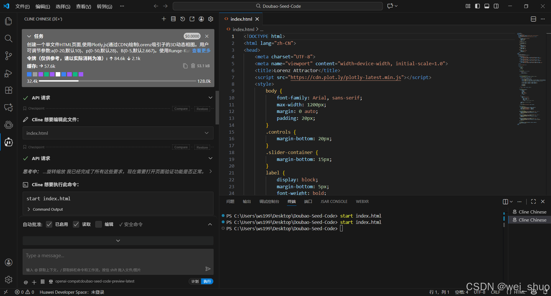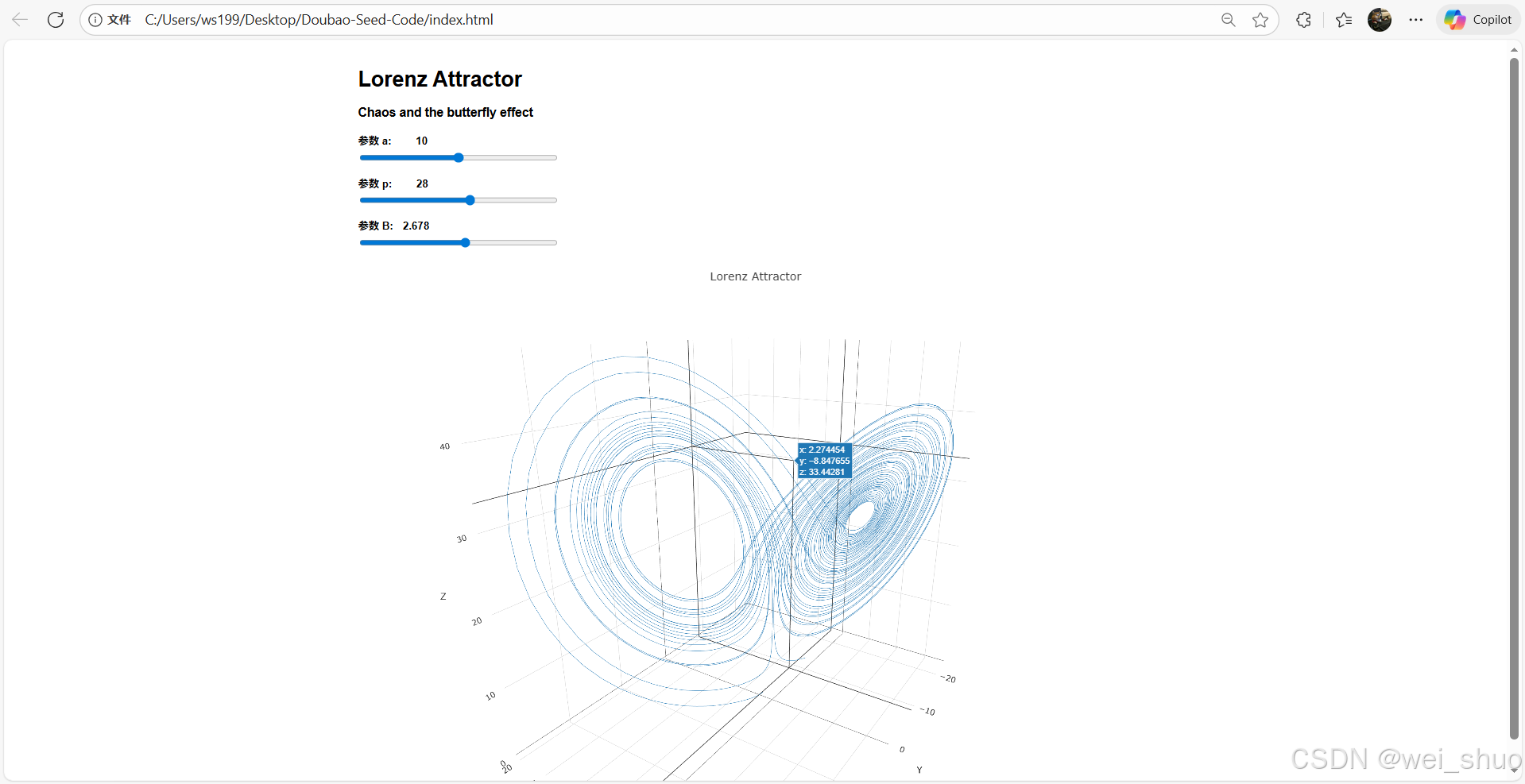 bash创建一个单文件HTML页面,使用Plotly,js(通过CDN)绘制Lorenz吸引子的3D动态相图。用户可调节参数:a(0-20,默认10)、p(0-50,默认28)、B(0-5,默认2.667)。使用Runge-Kutta方法数值求解微分方程,轨迹点数5000。包含滑块控制参数,实时更新3D图。标题"LorenzAttractor",副标题"Chaos andthe butterfly effect"。界面简洁,支持鼠标旋转缩放。要求:禁止使用任何改变应用结构或组件化范式的 JavaScript 框架/库(例如:React, Vue, Angular)。可以cdn引用第三方库以满足题目要求,如Three.js,p5js。最终产物必须是纯粹的 HTML、CSS 和 JS 文件。如果需要创建多个文件(HTML/CSS/JS),请确保所有文件引用均使用相对路径。 所有文件需要保存在workspace目录下2、我用它复现洛伦兹吸引子的可视化效果,通过给定官方提供的 Prompt 全程无需修改一次成功,精准生成了清晰的 3D 双螺旋 "蝴蝶翅膀" 轨迹,不仅完美匹配理论方程,连 "蝴蝶效应" 的动态逻辑都呈现得超到位,没有一点偏差,这种高效又精准的表现非常让人惊艳