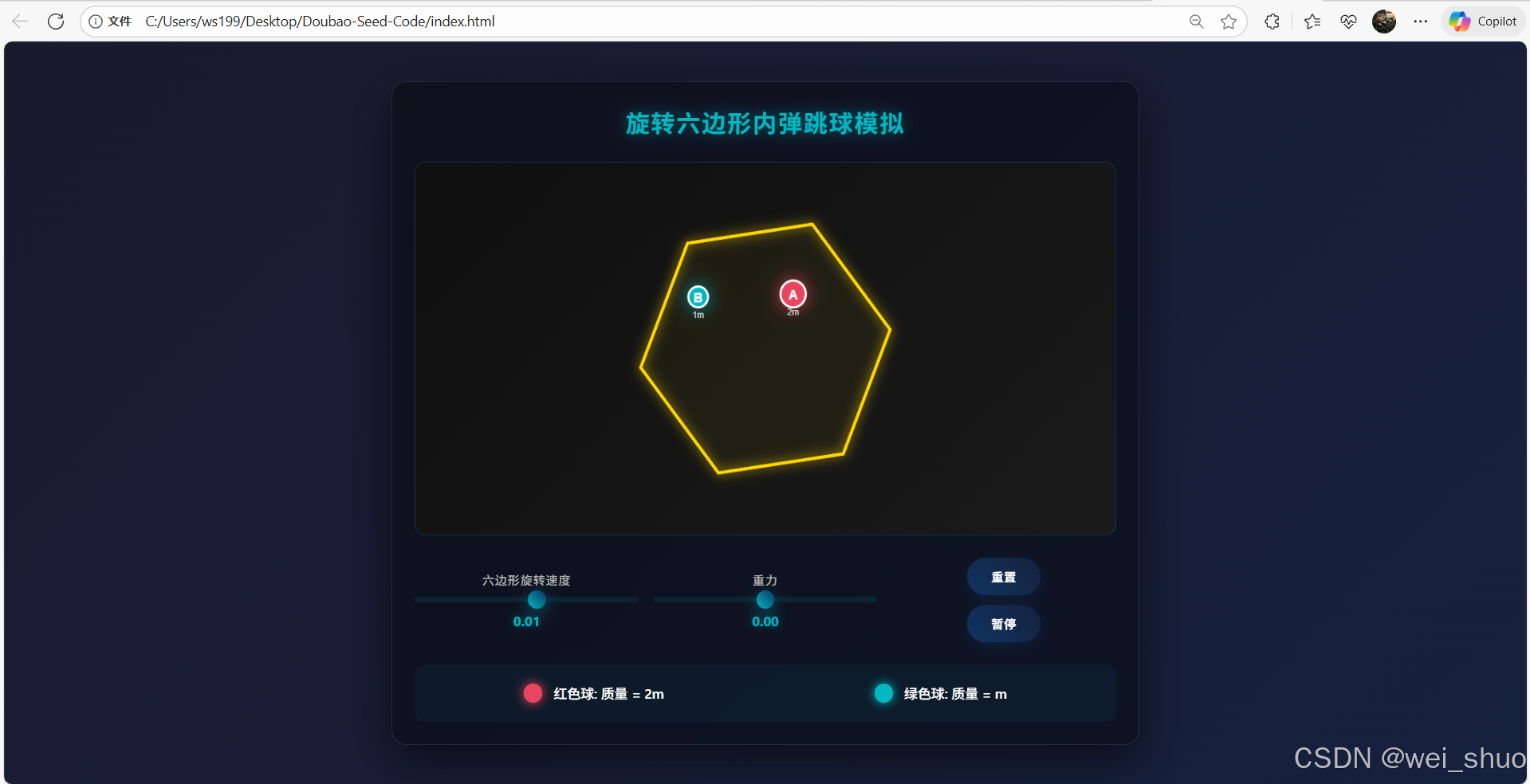 Doubao-Seed-Code 的代码生成与调优能力确实超出预期 ,复现旋转六边形内弹跳球模拟官方 Demo 时,原本需要手动写物理碰撞检测、旋转动画的时序逻辑,光是调小球碰撞的弹性系数、六边形旋转与小球运动的同步性,可能就得耗 1-2 小时;但用它生成初始代码后,只通过 3 次自然语言描述完成了精准调优