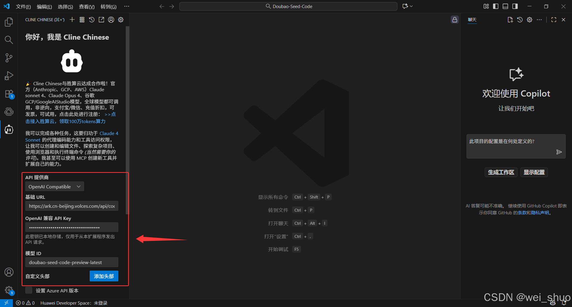 API Provider:OpenAI Compatible Base URL:https://ark.cn-beijing.volces.com/api/coding/v3 API Key:获取API Key Model ID:doubao-seed-code-preview-latest3、配置完成可以开始体验