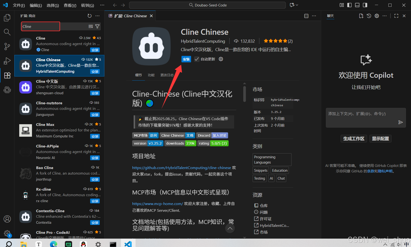 1、打开 VSCode,在扩展市场搜索Cline安装