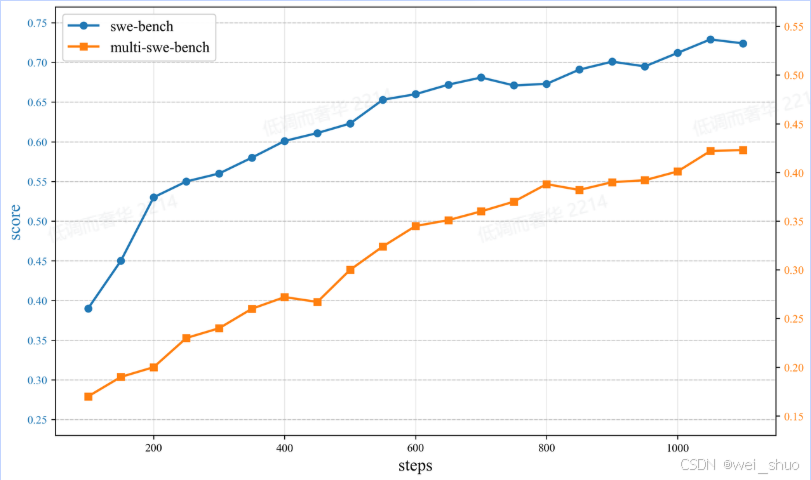 构建大规模 RL 系统用于 coding agent 训练,端到端模型训练的下游指标评测显示,性能实现显著提升。训练全程稳定可控,在 multi-swe-bench 与 swe-bench-verified 数据集上呈现一致上升趋势,充分印证模型优异的泛化能力;在 SWE-bench 基准测试中,仅依托 RL 训练便达到当前最优水平,彰显纯强化学习在真实软件工程场景的巨大应用潜力。