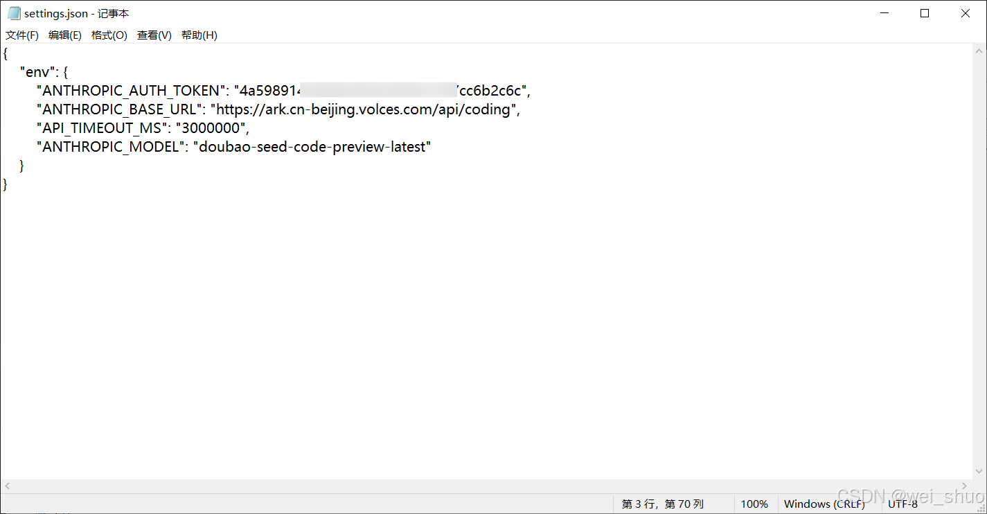 bashsetx ANTHROPIC_AUTH_TOKEN 你的方舟API Key setx ANTHROPIC_BASE_URL https://ark.cn-beijing.volces.com/api/coding setx ANTHROPIC_MODEL doubao-seed-code-preview-latest5、验证环境变量是否生效