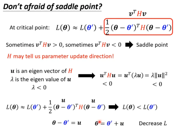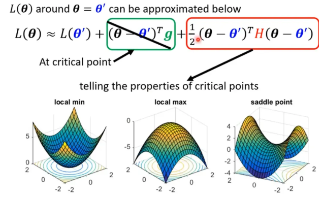 大概原理:Tayler Series Approximation 可以近似Loss函数某点附近的样子,critical point处绿色项为0,只剩红色项,只需判断H矩阵的特征值