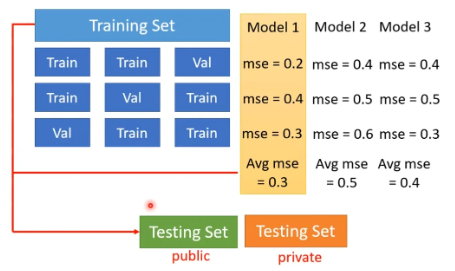 - 不建议的做法:直接比较model 在 public testing set的分数来选择。WHY?类比猴子敲出莎士比亚,如果test很多遍,即使是很废模型,还是有可能拿到好分数