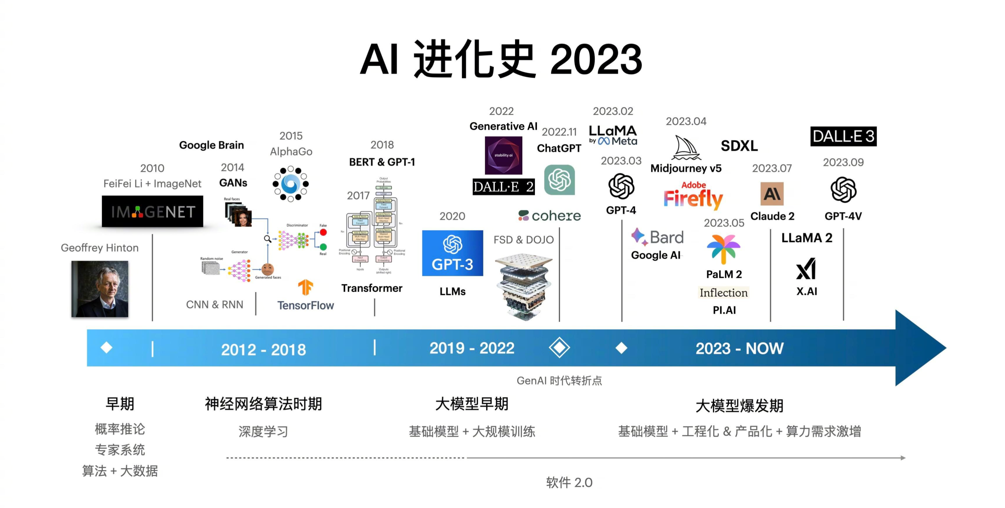 - 神经网络算法时期(2012-2018):AlexNet (2012)、CNN/RNN广泛应用、ImageNet突破、GPU加速训练、自动驾驶/语音识别爆发