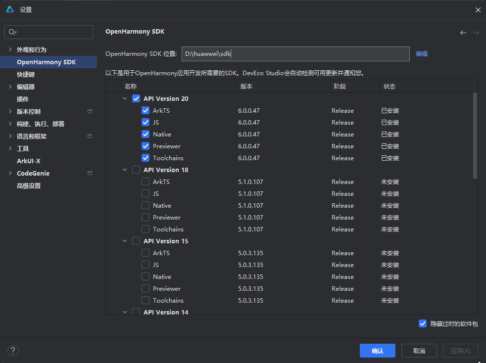 于是一直搜,发现网上很多是需要下载HarmonyOS SDK跟OpenHarmony SDK,HarmonyOS SDK却不需要设置下载。打开一个项目,查看外部库,好家伙,下面的外部库sdk居然就在DevEco Studio安装的目录下面。比如我的在D:\Program Files\Huawei\DevEco Studio,则设置环境变量 HOS_SDK_HOME = D:\Program Files\Huawei\DevEco Studio\sdk 即可。改完之后,创建鸿蒙flutter就可以了