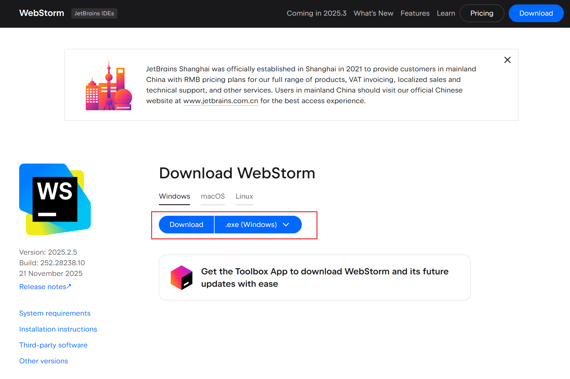 打开浏览器,访问JetBrains的官方网址,点击如下网址能直接跳转到WebStorm的下载页面: