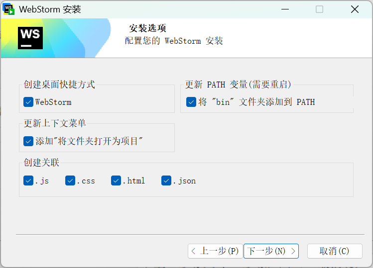 最下面的创建关联就是勾选的后缀文件默认以WebStorm打开,想勾选就勾选,不勾选也行。一般前端就是用WebStorm和VSCode,我之前学习JavaWeb的时候也用过VSCode,我个人比较喜欢Jetbrains家的ide,按自己喜好来吧。如果你有VSCode,想用VSCode打开时不直接点击文件而是右键选择用VSCode打开即可