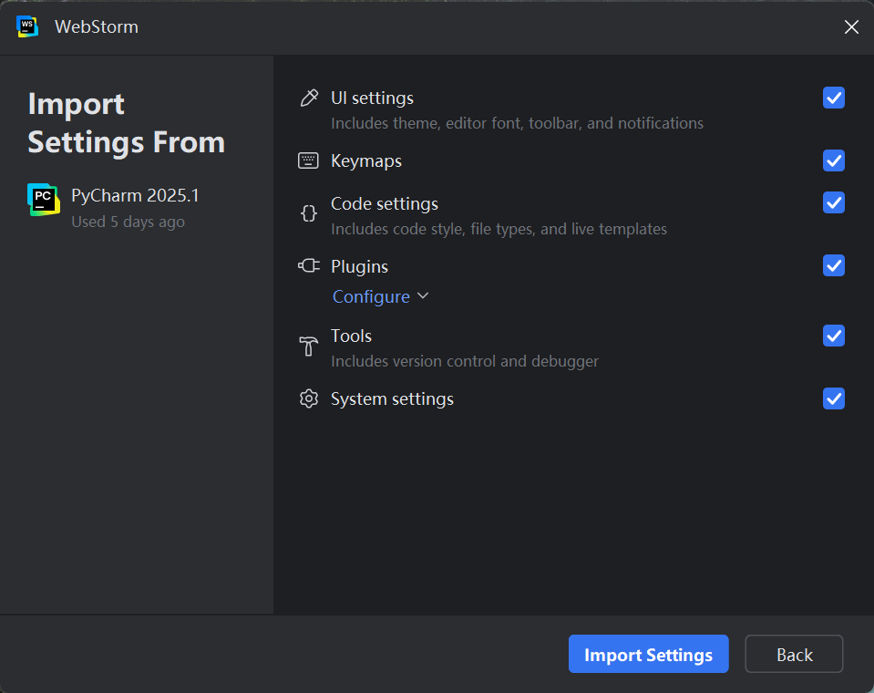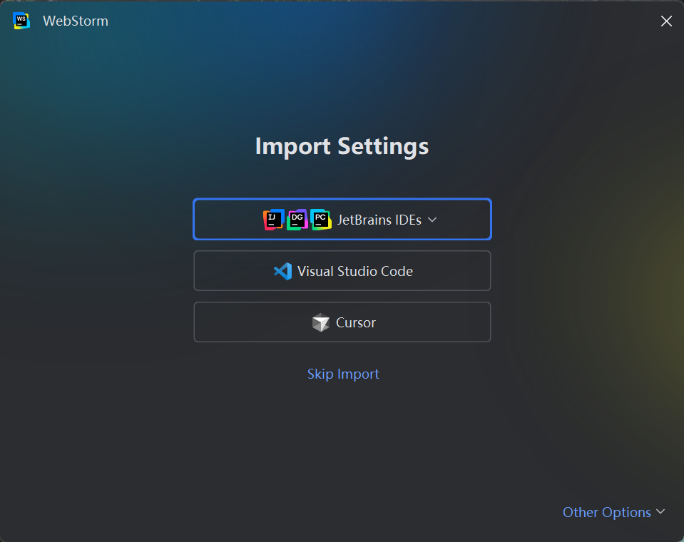 首次运行会出现导入设置的界面,这里自由选择。我的话之前其他ide的字体相关改成了自己喜欢的配置,所以我就选择导入其他JetBrains IDE的配置了