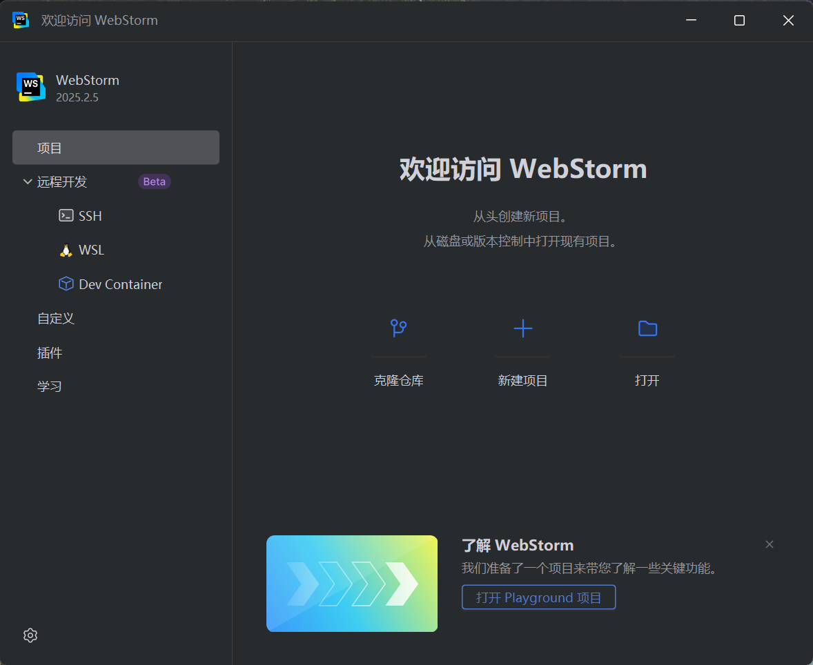然后WebStorm从24年10月开始就是免费的了,所以不需要任何许可证直接下了就能用,并且也不需要像Java和Python那样配JDK和解释器,整体还是很简单的