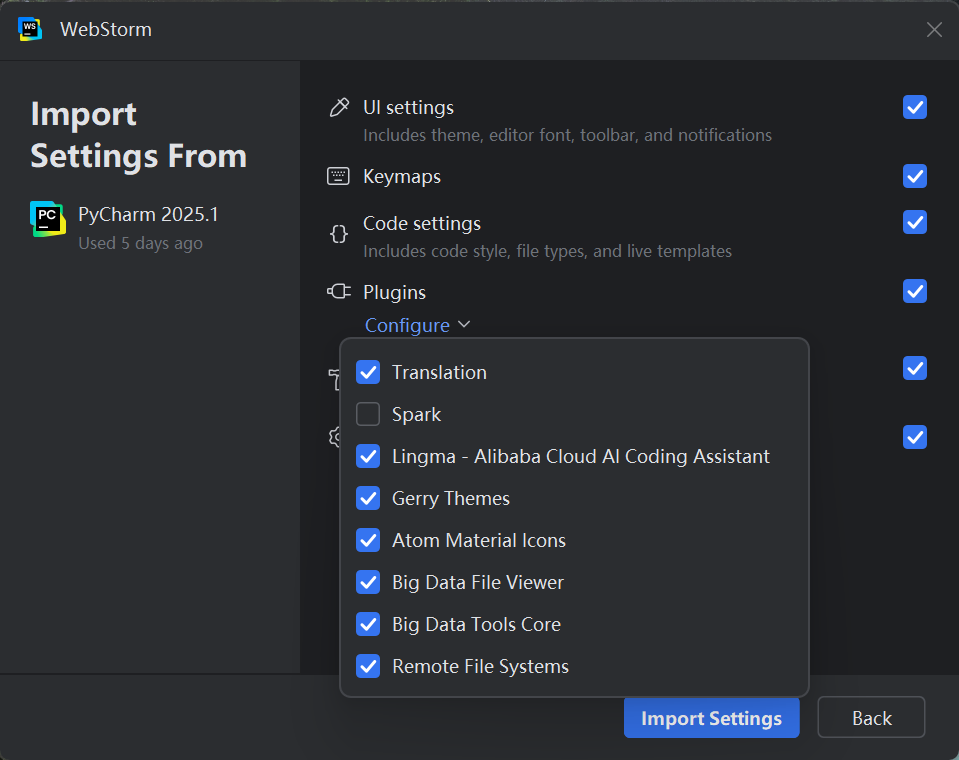 比如这里的Spark插件我就不导入进去了,因为这个是Python的Spark库安装的插件