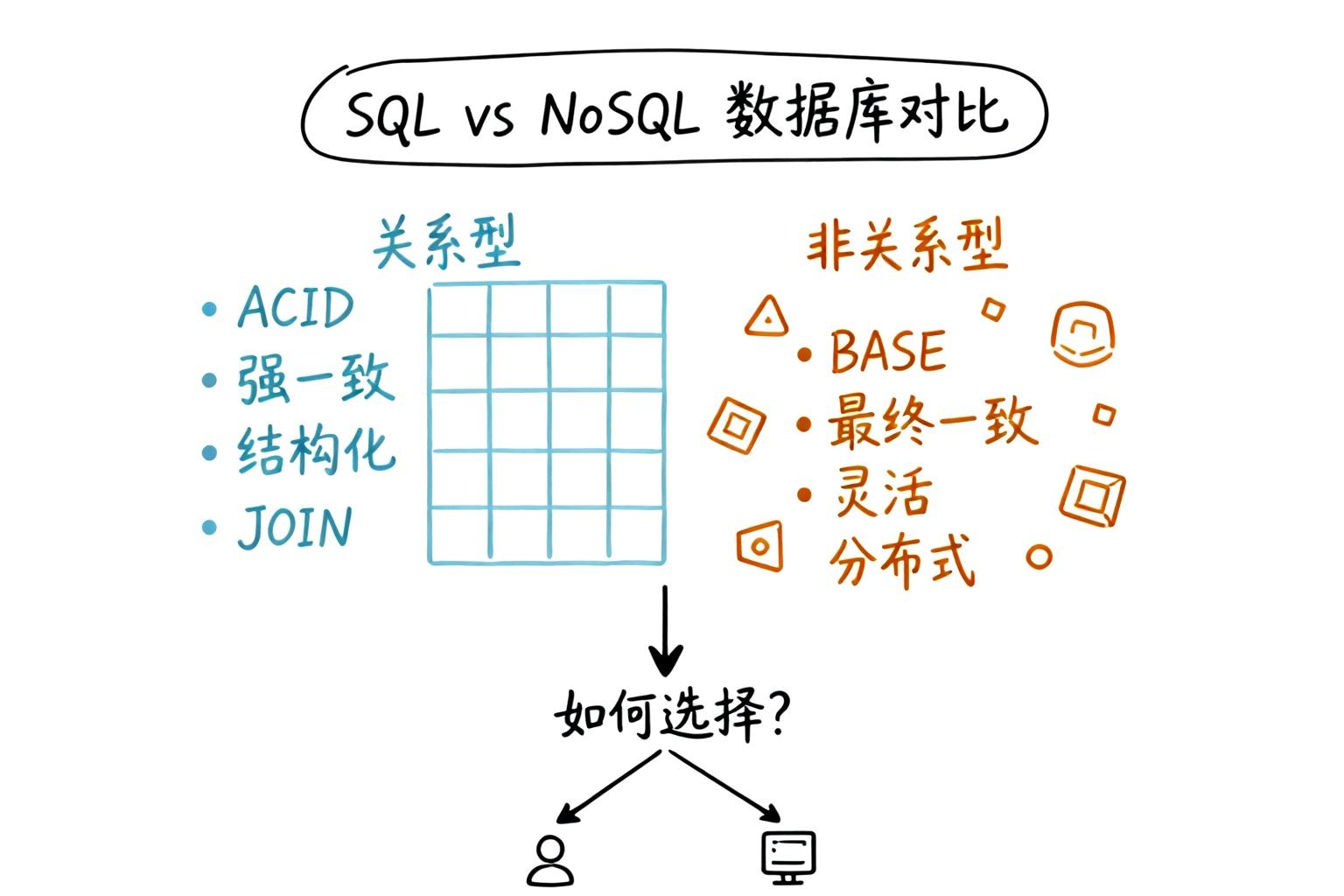 | 存储方式 | 行式存储,读取整行数据 | 多样:内存(Redis)、列式(HBase)、文档(MongoDB) |