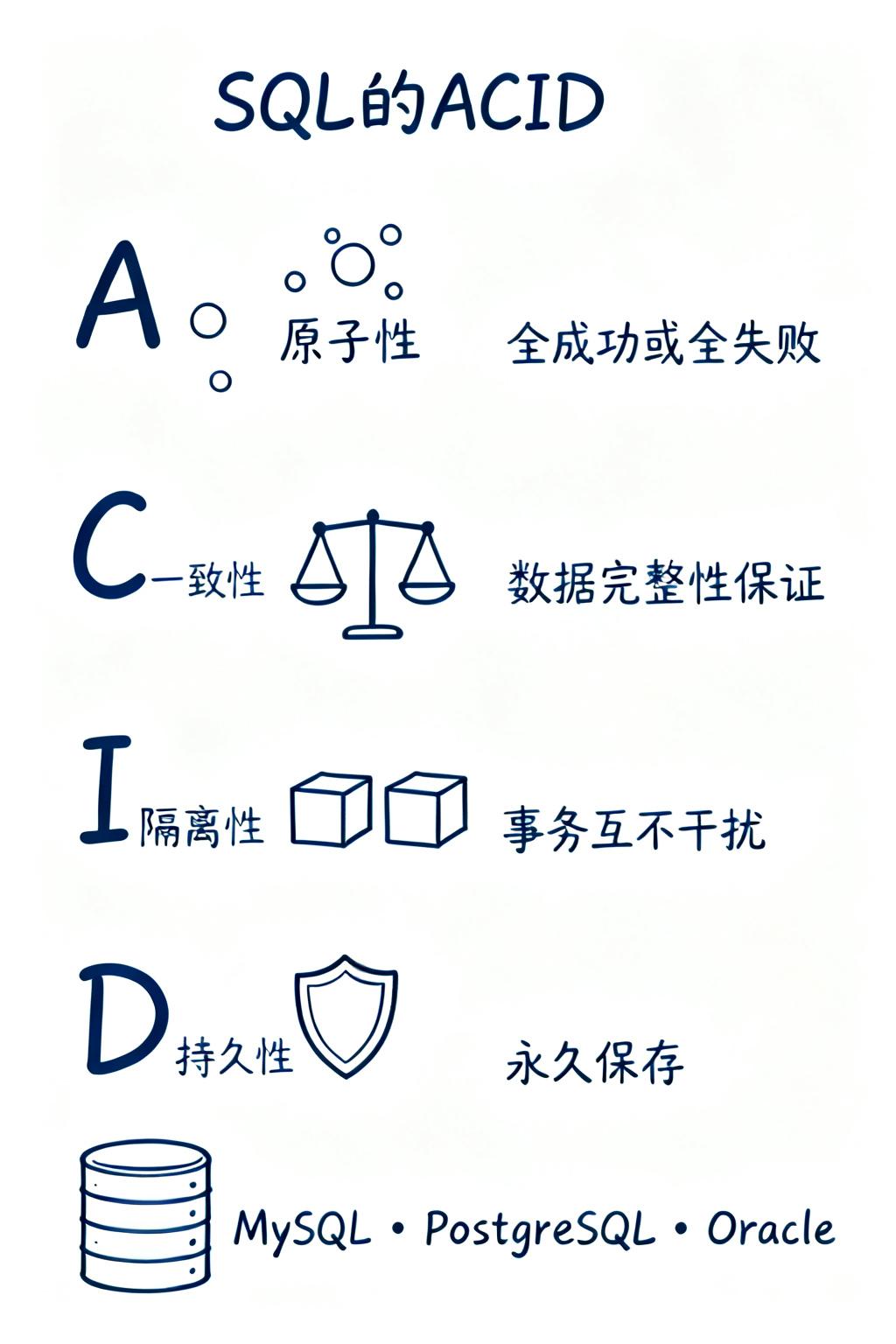 SQL(Structured Query Language)数据库,即关系型数据库管理系统(RDBMS),是建立在关系模型理论基础之上的数据库系统。它采用二维表格结构组织数据,通过外键建立表与表之间的关联关系,使用标准化的SQL语言进行数据定义、查询、更新和管理。SQL数据库严格遵循ACID原则,确保数据的完整性和一致性。
