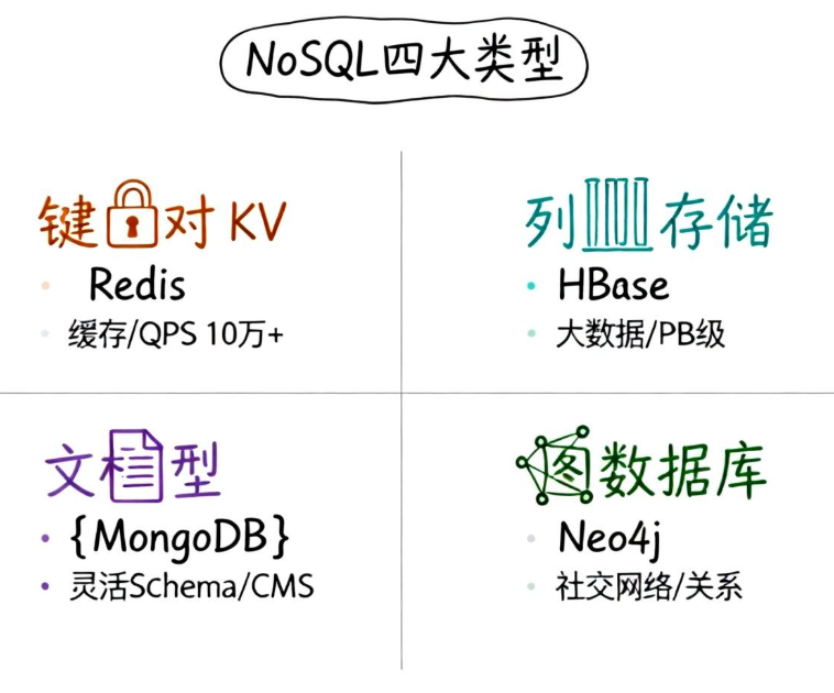 NoSQL数据库根据数据模型和使用场景,主要分为四大类型,每种类型都针对特定问题域进行了优化。