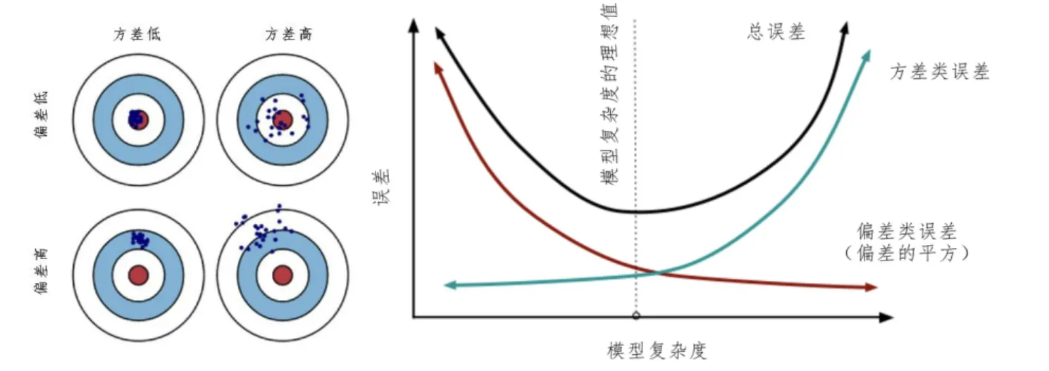 | 定义 | 模型预测均值与真实值差距大,拟合能力弱 | 模型在不同训练集上预测结果波动大,稳定性差 |