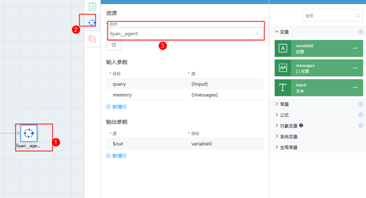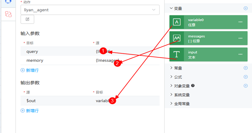 步骤 15 将messages和input参数拖拽进入参位,variable0拖拽进出参位