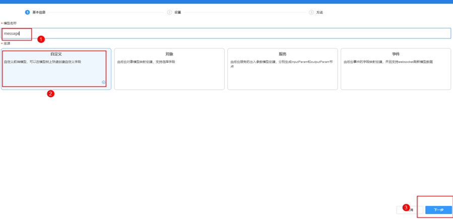 步骤 3 点击智能助手组件,点击右侧菜单栏数据绑定设置按钮,点击新建模型,输入模型名称message,来源选择自定义,一直点击下一步,直至确定。