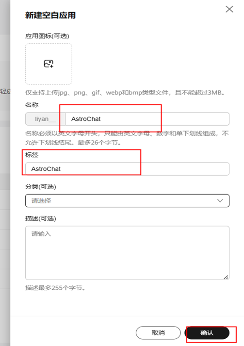 步骤 3 填写"新建空白应用"的基本信息:设置"标签"为"AstroChat","名称"为"AstroChat",单击"确认"按钮。
