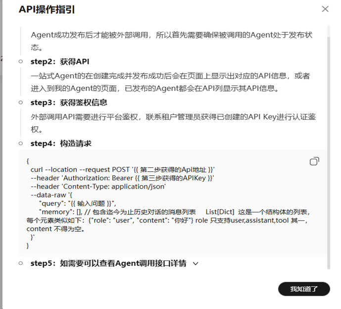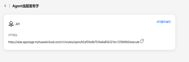 步骤 6 发布成功后我们会得到发布成功的API地址(复制保存),点击API操作指引可以阅读了解该API的调用参数为query和memory ,调用方式为Post方法,鉴权方式为消息头鉴权。