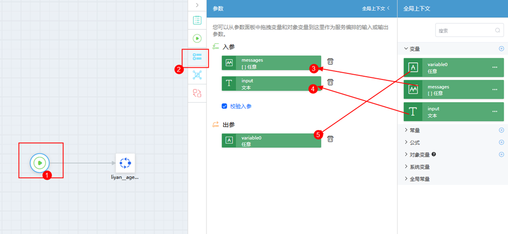 步骤 13 点击开始图元,点击右侧参数按钮,将messages和input参数拖拽进入参位,variable0拖拽进出参位