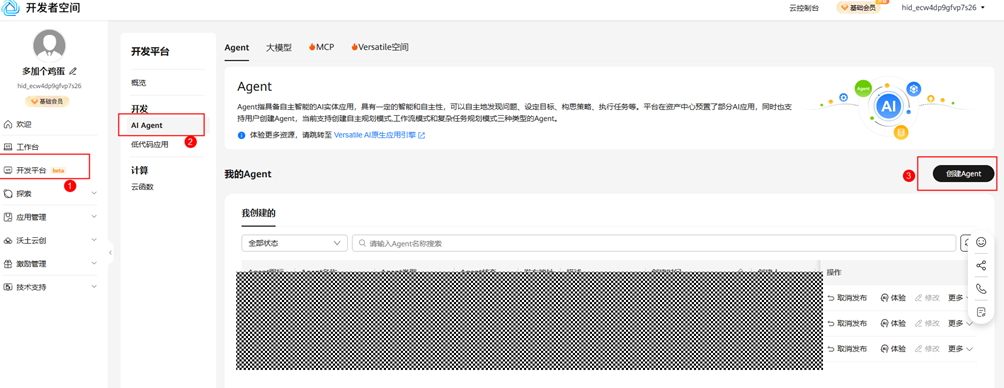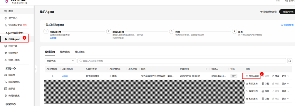 步骤 5 点击左侧菜单栏"我的Agent",找到刚才创建的Agent点击操作栏"发布Agent"返回步骤3的发布页面;