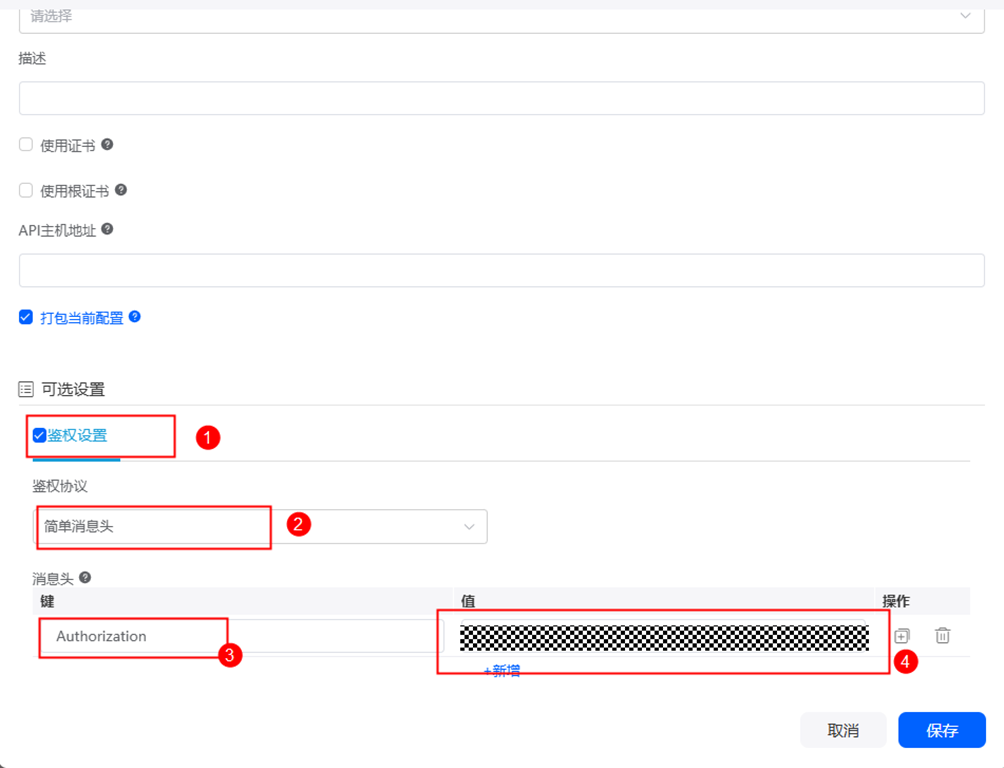 步骤 8 下拉选择鉴权设置,鉴权协议选择简单消息头,键为Authorization,值为前面步骤4获取的"Bearer+ApiKey(任务一中保存的ApiKey)的值",二者之间需要有空格,假设我的ApiKey的值是abcdefg,那么此处我需要填写的内容则为Bearer abcdefg(注意空格),点击保存