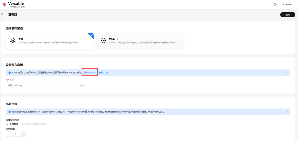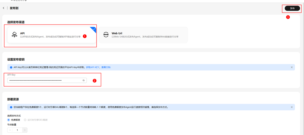 选择发布渠道为API,设置发布密钥为刚才下载的API Key,点击发布。