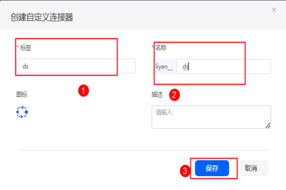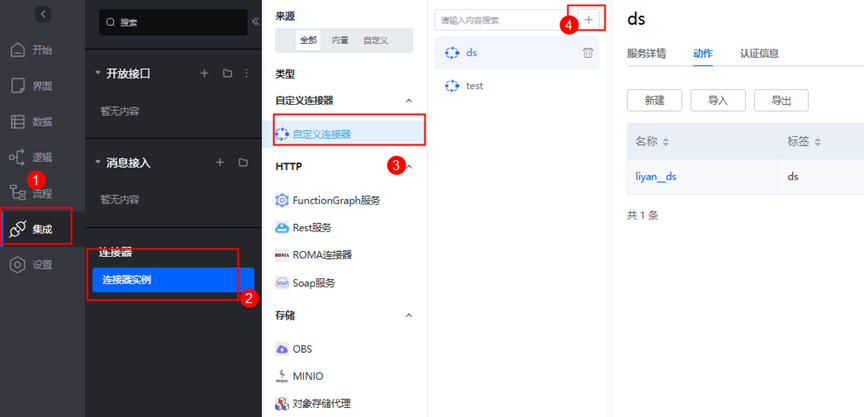 步骤 1 进入刚才创建的应用中,点击左侧集成>连接器实例>自定义连接器,击右上角加号,创建自定义连接器,输入标签名和名称为ds(可自定义);点击保存。