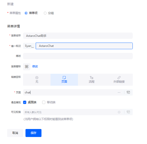 2. 在"导航设置"页面,单击"新建"按钮,设置菜单名称为"AstaroChat助手"、唯一标识为"AstaroChat",(命名皆可自定义)在选择页面弹出框中,选择"chat"(为之前步骤创建的对话界面名称),单击"确定"按钮,最后单击"保存"。